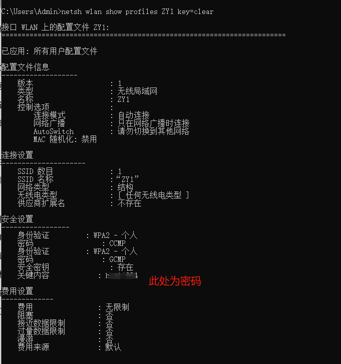 ## 查询密码 netsh wlan show profiles WiFi名称 key=clear